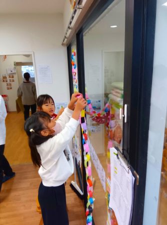 当日までに折り紙で作った飾りを部屋のいろんな場所に貼っていきます。