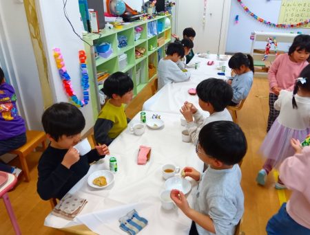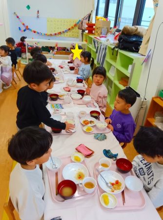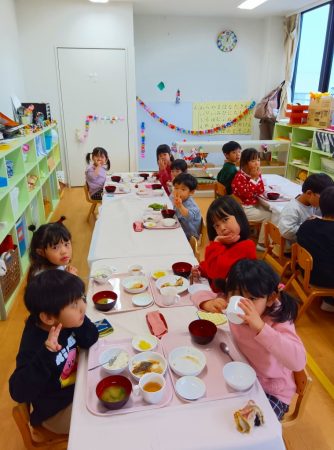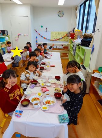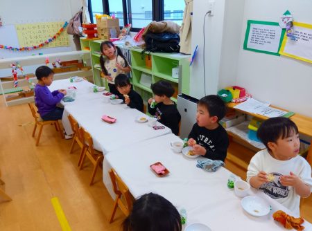 沢山のお友だちと顔を合わせて食べられるのでお話をしながら食事を楽しみました。