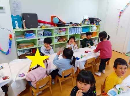 お昼ご飯とおやつはランチルームも飾りつけをして、テーブルもいつもとは違う配置にしました。