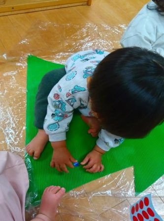手先を上手に使い、丁寧にシールをはがし、ペタっと貼ったり…保育士と一緒にシールを貼ったり、