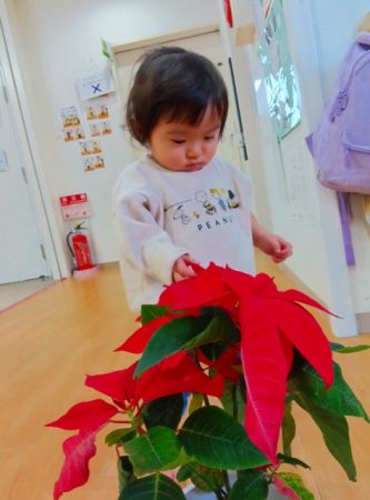 お部屋の前にある大きなクリスマスツリーを見に行ったり、ポインセチアを見たり、