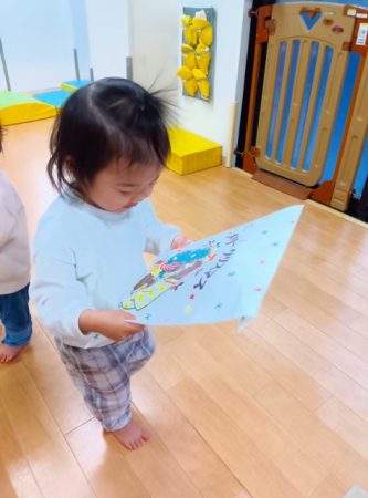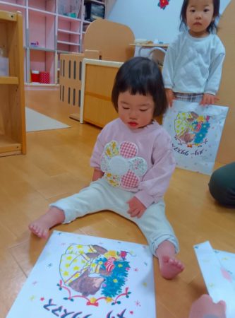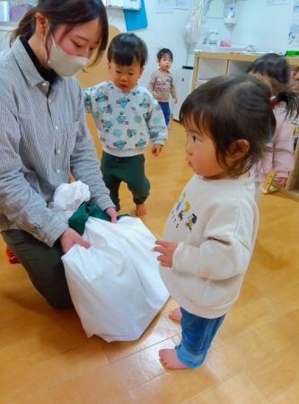 「何?何?」と、不思議そうにしていた子どもたち、保育士がプレゼントが届いていることを伝えると大きな袋をじーっと見ていました。