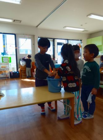 ぞうきんを絞る時はお友だちにかかってしまわないように並んで順番にやっていました。