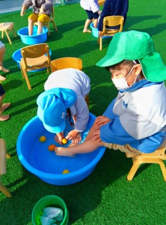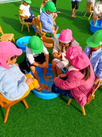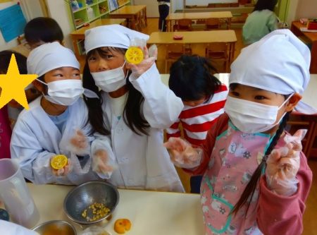 子どもたちから「ジュース作りたい」という声が上がったので、たいよう組が主になって、ゆずジュース作りです。