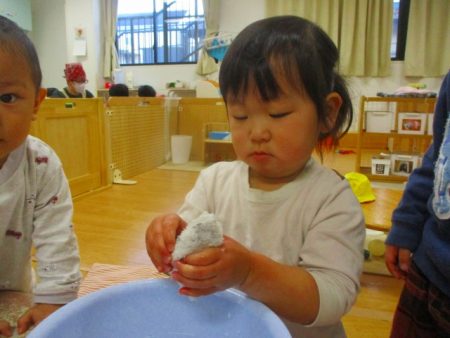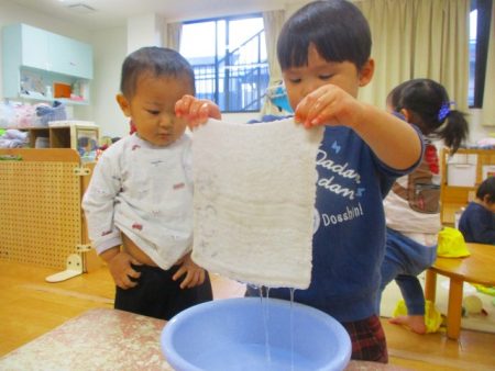 最後は拭いた雑巾を濯いでしぼって…を保育者とやってみる子も。水が少し濁ったり、ちりが浮いたりしたのを、真剣に観察もしていましたよ。