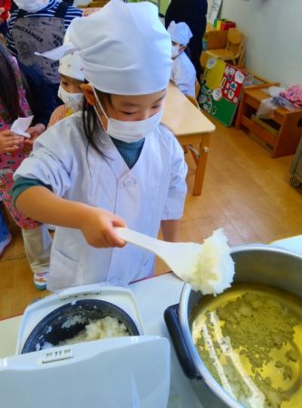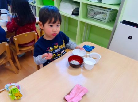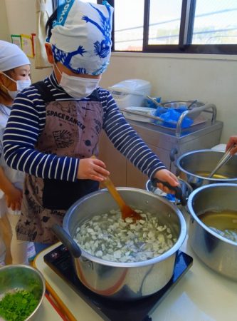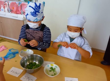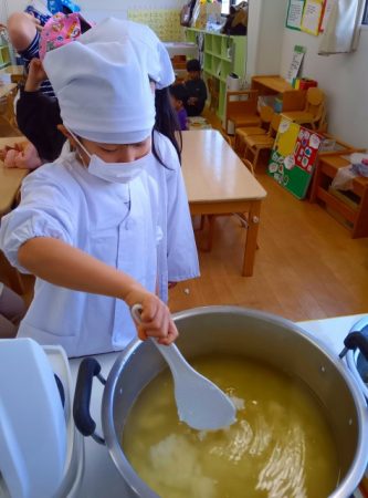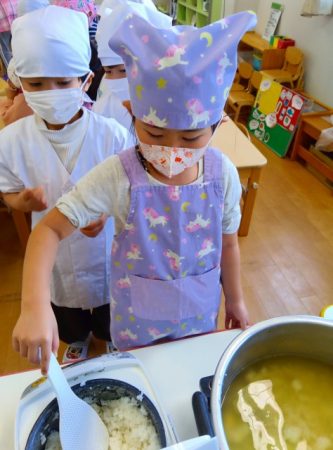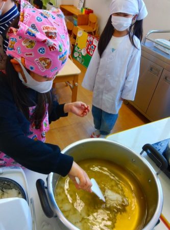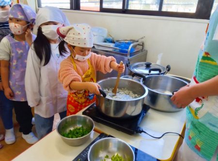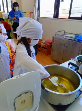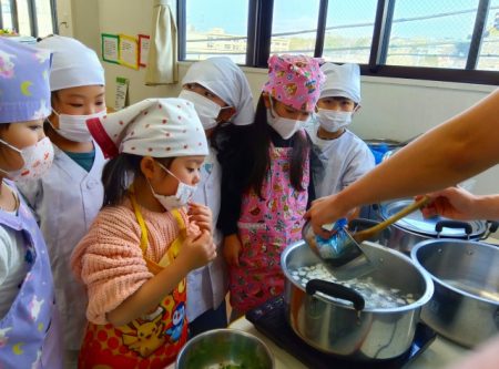 たいよう組では希望児が七草を調理して七草がゆを作りました。