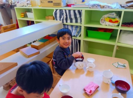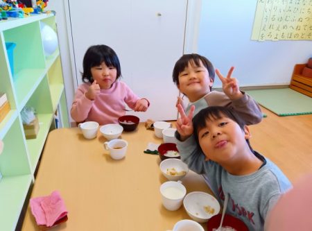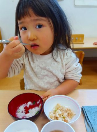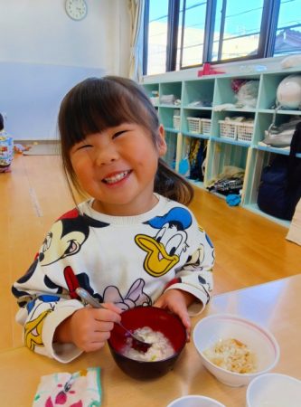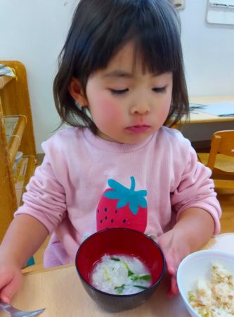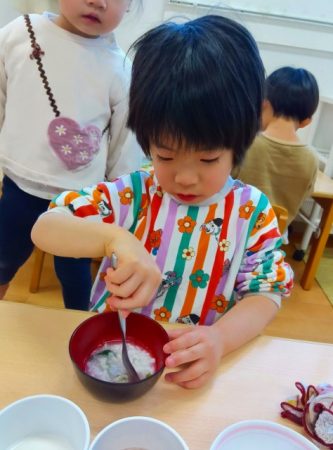 お兄さんお姉さんが作ってくれた七草がゆ。緑色の葉っぱが入っていたけど、食べたら出汁が効いてて美味しそうに食べていました。