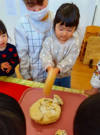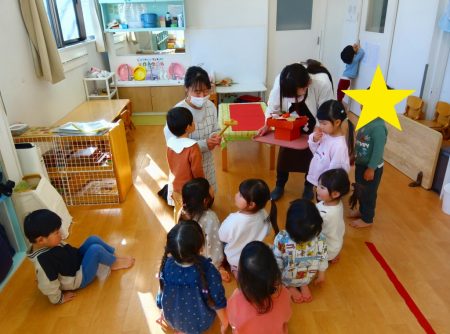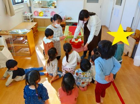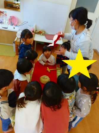 今回はさくらんぼ組、ふたば組、つぼみ組の乳児クラスで鏡開きをしたので