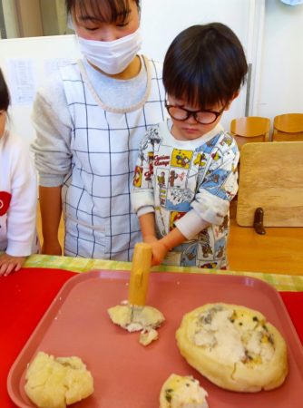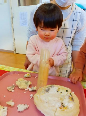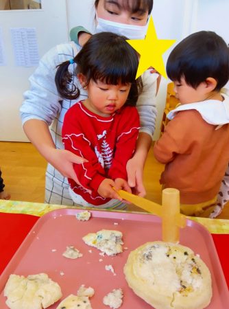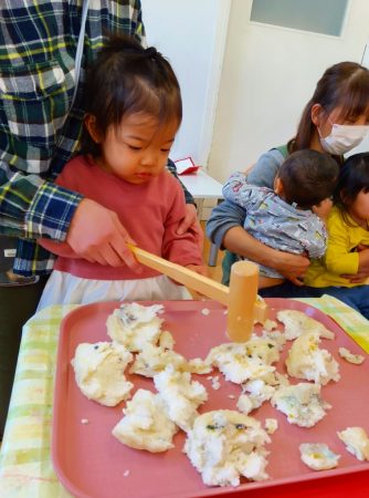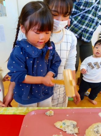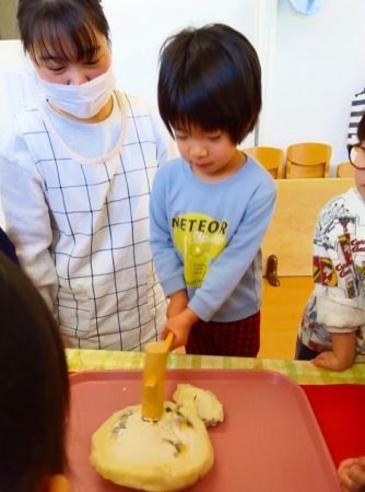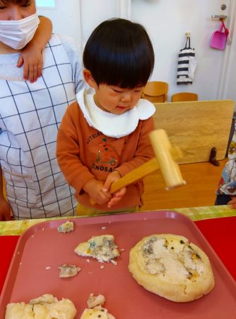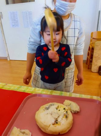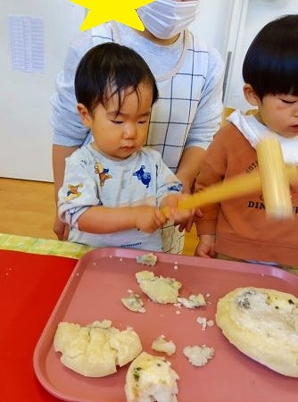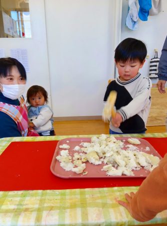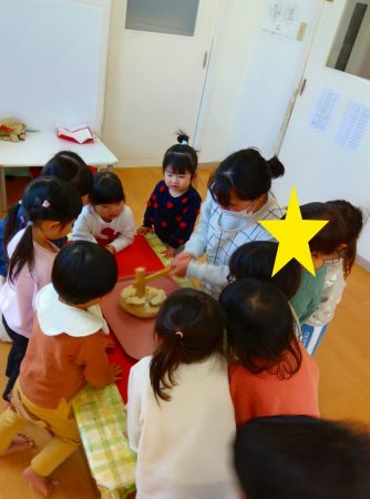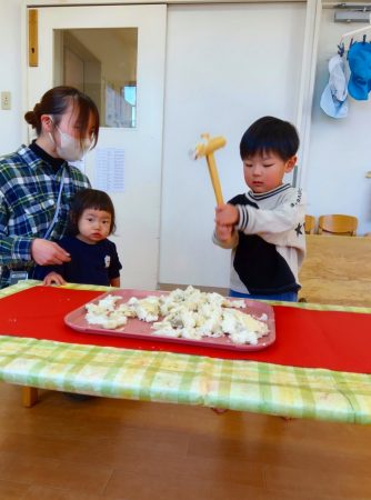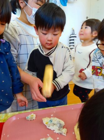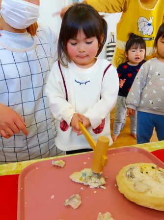 木槌を使って鏡開きをやってみて子どもたちから「鏡開き楽しいね」とお話していました。