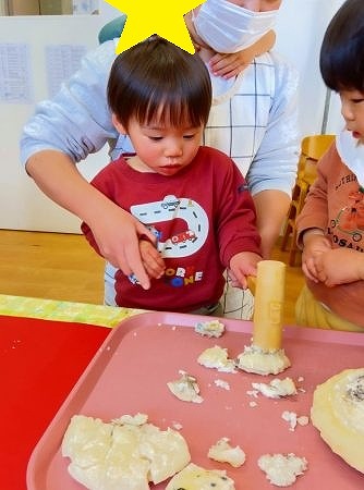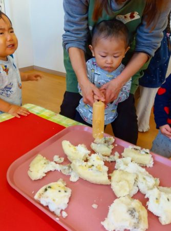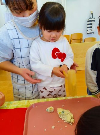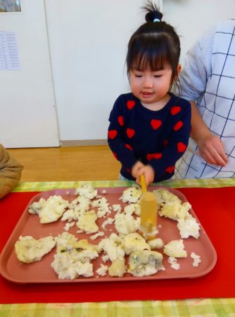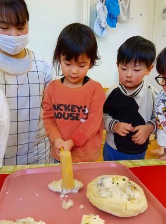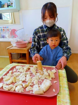 つぼみ組では、お餅からおかきが出来る事を伝え、実際にお餅から作ったおかきを提供しました。(衛生面上、開いたお餅は使っていません。)