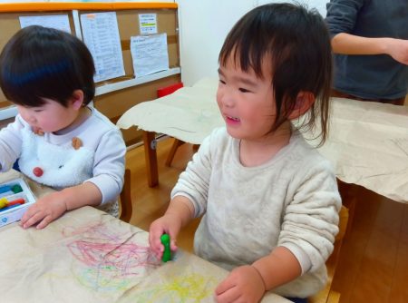 お絵描きが大好きな子どもたちは大きく腕を動かしながら色や形で自分のイメージしたものを自由に表現していました。まだ寒い時期が続くので、お部屋での遊びも楽しんでいきたいと思います。