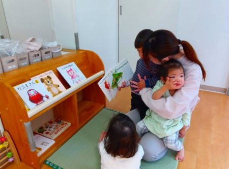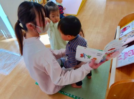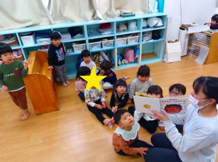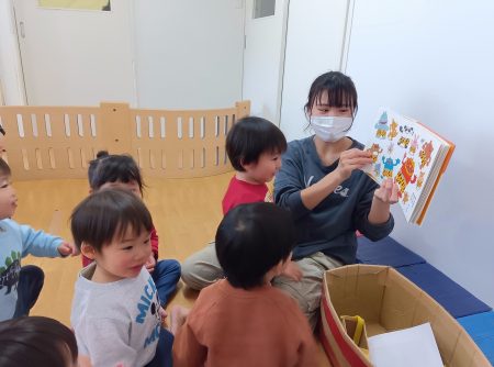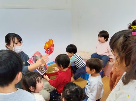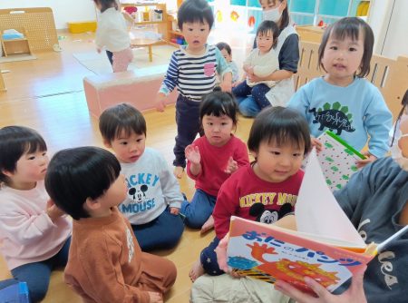 「♪おにのパンツ」の絵本を見て、陽気なうたに子どもたちが集まります。