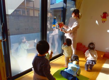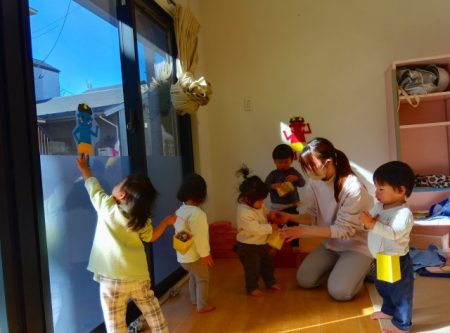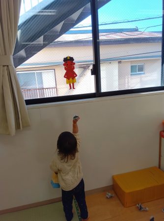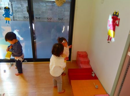 絵本に出てくる鬼が保育室の壁や窓にもいることに気付くと、