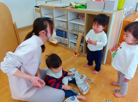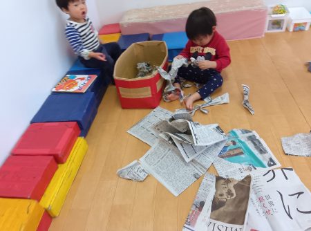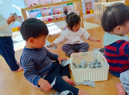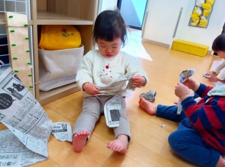 保育士が新聞紙を破いて丸める姿を見て、