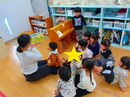 「鬼はなまはげなんだよ」や「豆を投げて鬼をやっつけるんだよ」とお話をする子どもたちで夢中になって聞いていました。