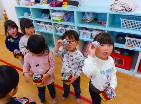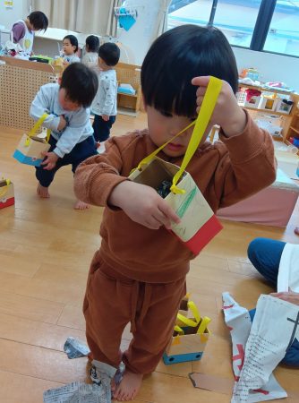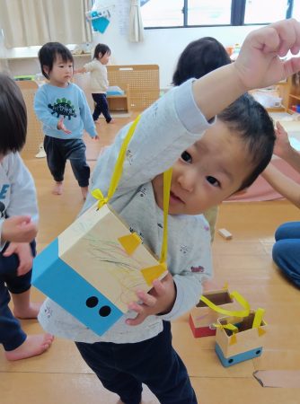 子どもたちは自分で作った手作り豆入れを友だちに見せ合っていました♪