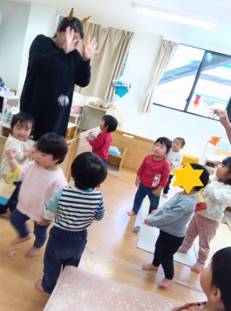 「はこう、はこう、おにのぱんつ♪」子どもたちも指でツノを立てながら楽しみます。