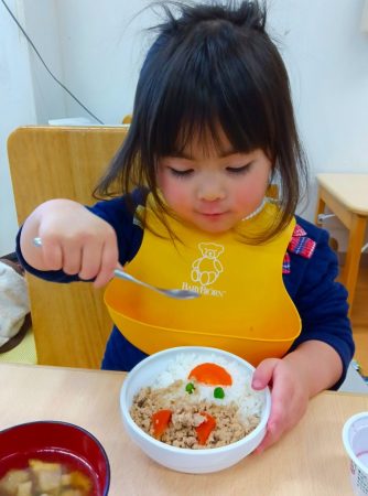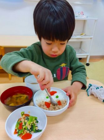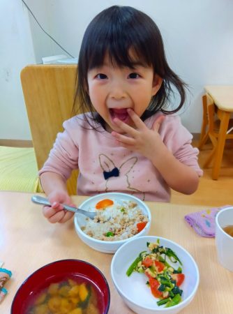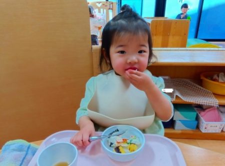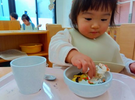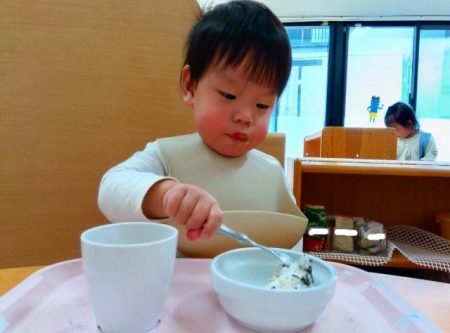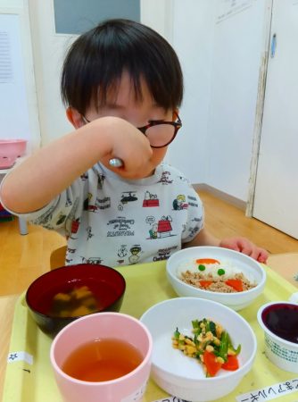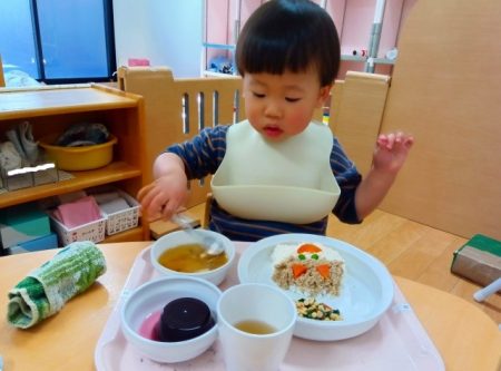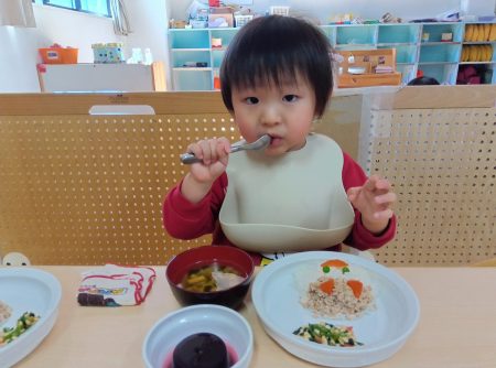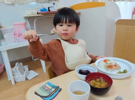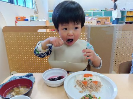 「ツノある!」と1本指を2つ立ててまねしたり、「おめめみどり」とグリンピースの目を上手にすくったりしながら、嬉しそうに食べていた子どもたちです。