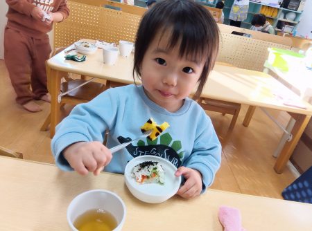 お昼ご飯は鬼の顔のご飯、おやつは恵方巻でした。