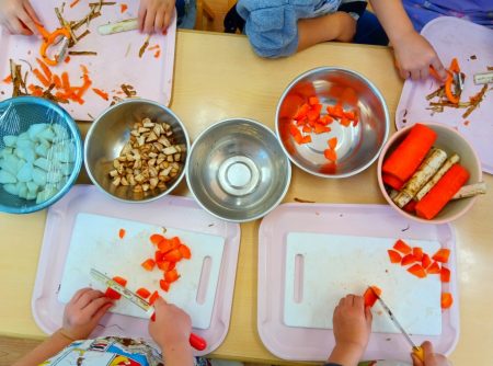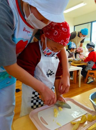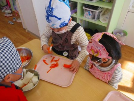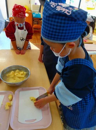 「かたいー」と少し苦戦した子どもたち。調理さんと一緒にどんどん切っていきます。