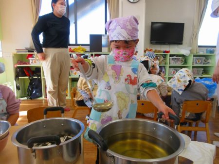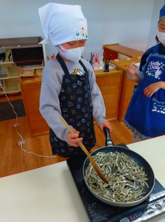 「浸るまでってなに?」新しい料理の言葉も知りつつ、協力して入れていきます。