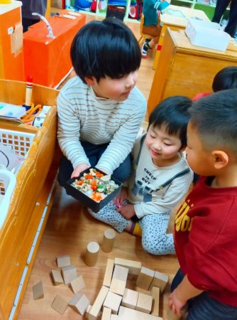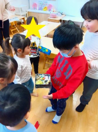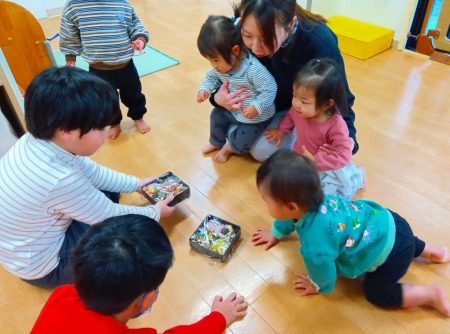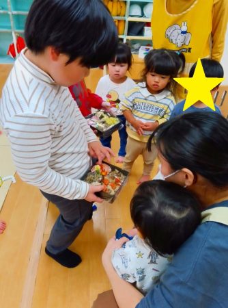 午後にはたいよう組で重箱におせちを詰めて、幼児クラスや乳児クラスのお友だちにも見せに行きました。
