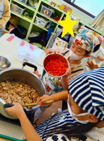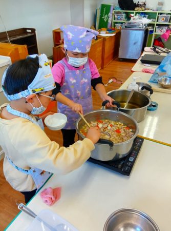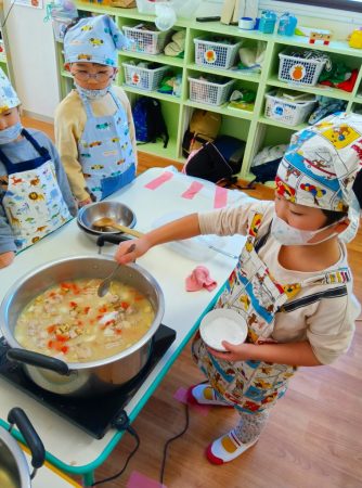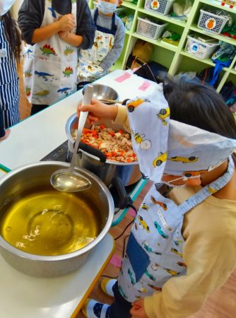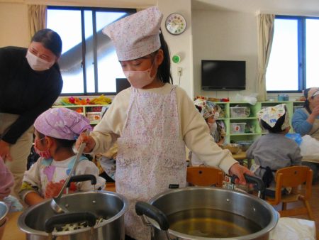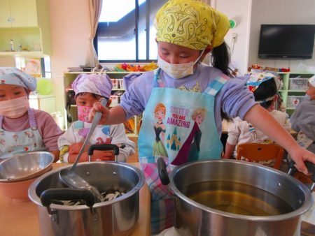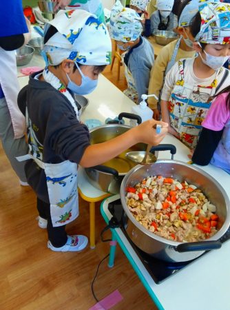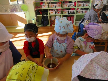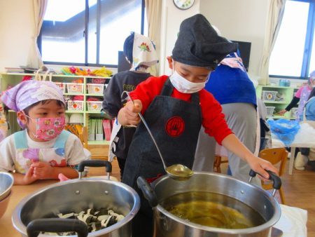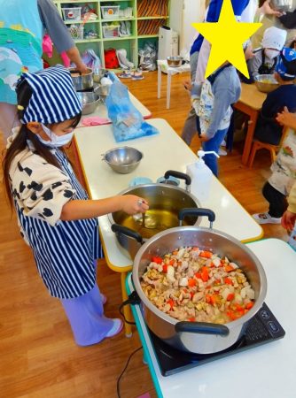 順番に木べらで混ぜていくと「いいにおいしてきた」と嬉しそうな子どもたち。