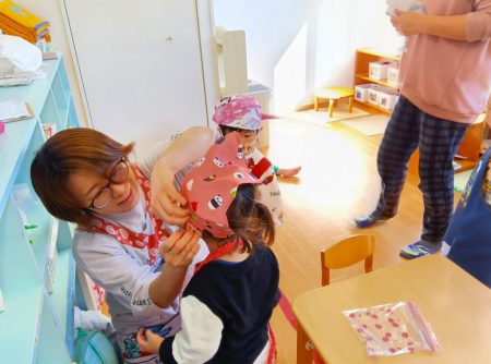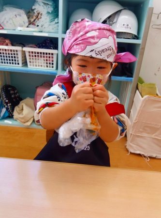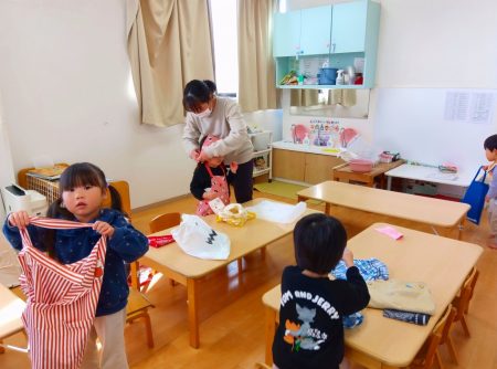 当日は、嬉しそうに自分のエプロンを身に付けてお友だちに「見てみて~」とエプロンを見せ合っていました。