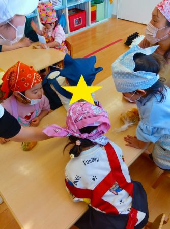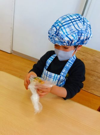 エプロン、三角巾を身に付けてのクッキングは初めてだったので、つぼみ組の子どもたちはとても楽しみにしていました。