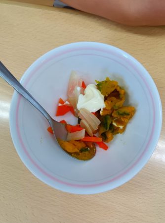 給食では、自分で作ったかぼちゃサラダを食べました。