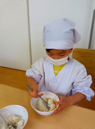 「青のりのいい匂いがしてきた~」や「チーズ美味しそう」と言いながら混ぜていました。