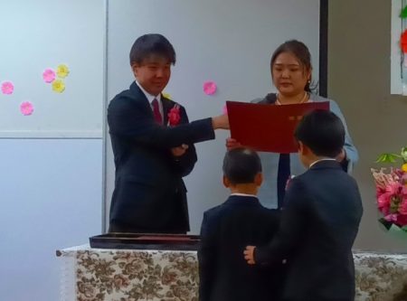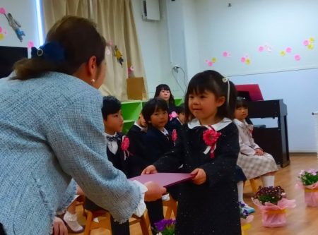 園長先生と目を合わせて一礼してから証書を受け取ります。