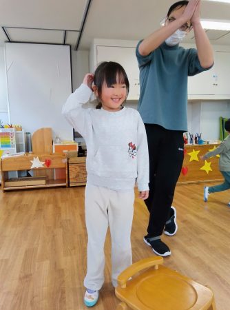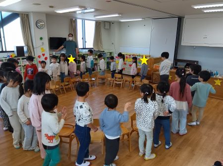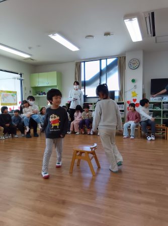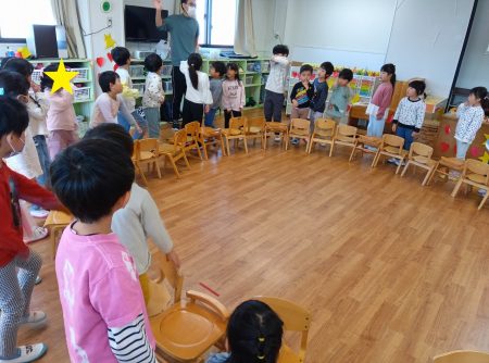 はじめはゲーム遊び。みんなで一緒に椅子取りゲームです。