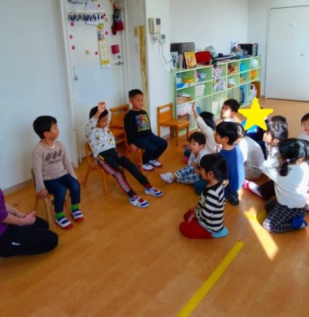「好きな遊びは?」「好きな食べ物は?」とお誕生日の3人に質問する子どもたちでした。
