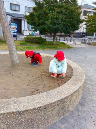 木の実拾いをしたり、滑り台やロープタワーなどの遊具で元気に遊ぶ子どもたちでした。