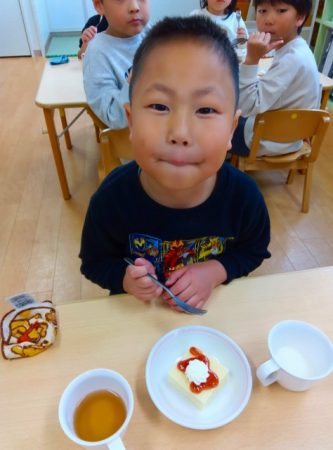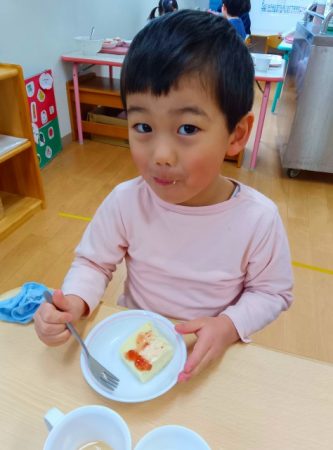 いただきますの挨拶をしてみんなで作ったケーキを食べて楽しみました☆