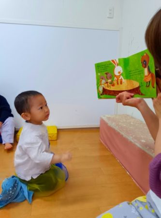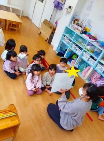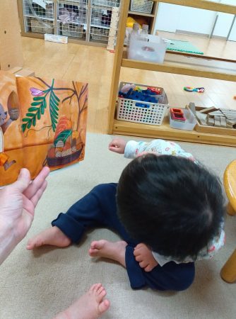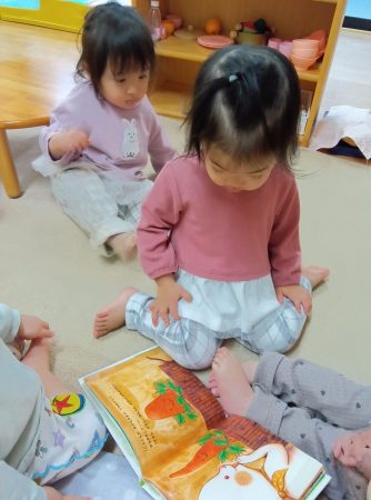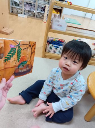 さくらんぼ組のひなまつりは、みんなでひなまつりの絵本を見て、保育園の中のひな祭り探しをしました。