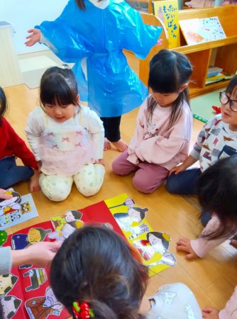 はじめに「ひなまつりはどうやって飾るの?」という紙芝居を読んでからひなまつりの由来について説明しました。