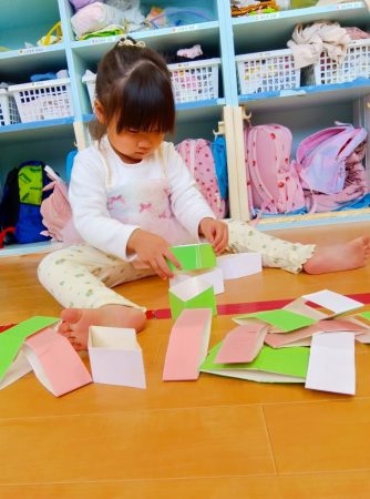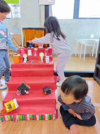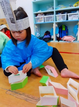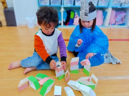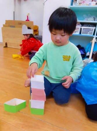 ひしもちの積み上げゲームでは、たくさん積み上げたり、緑、白、ピンクと順番に積み上げていました。