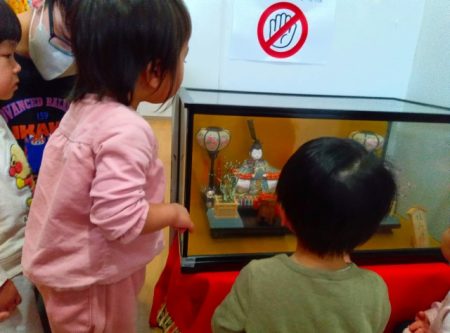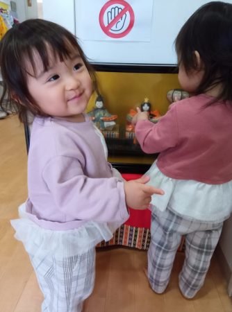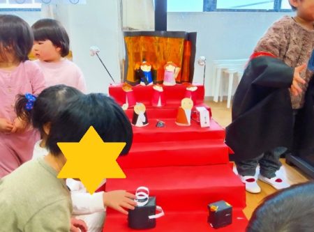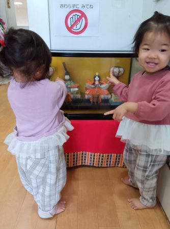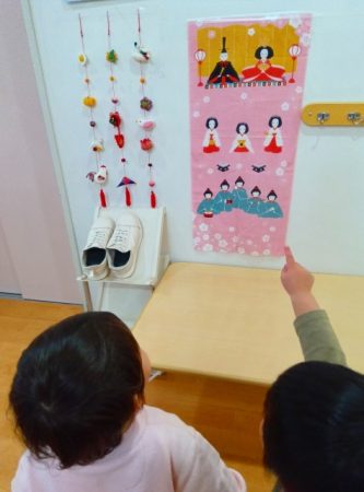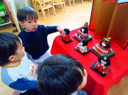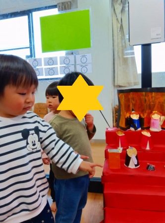 「お雛様、お内裏様!」と言ったり「ひなあられ食べる」と言ったり「あかりをつけましょ ぼんぼりに~」と歌をうたう子もいました。