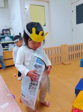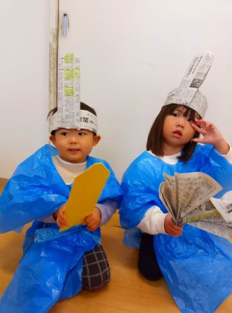 自分たちのお部屋では、新聞紙等で烏帽子や扇をつくって、簡単ななりきり気分を楽しみました。