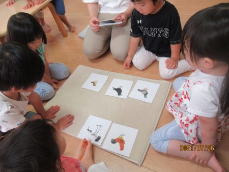 モンテッソーリ活動では、幼児クラスから鳥の絵カードをかりて、楽しんでいます。