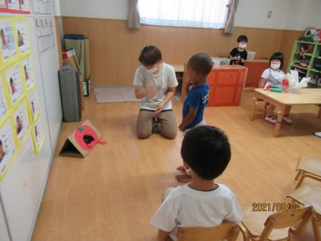 あゆみさんが来てくれて「トマトけん玉です」「こうやってやります」見本を見せています。あゆみさんも カップの中にぴょこっと小さなトマト玉が入って みんなで拍手をしました。