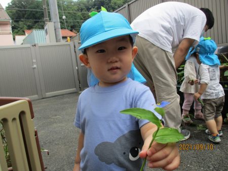 めばえ組が収穫したオクラとナスを見せてくれました。「わあっ」と驚いた表情をして興味津々でした。