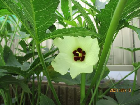 園庭散策をしていると子どもたちが「オクラの花が咲いていること」、「大きなオクラとナスが実っていること」に気づき、じっくり観察。