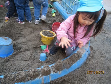 誕生日の歌がはやっていて、積み木でケーキを作り、保育者と一緒にお祝いをして楽しんでいます。