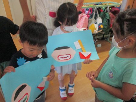 子どもたちが作った歯ブラシでゴシゴシ「よく磨けてるでしょ!」