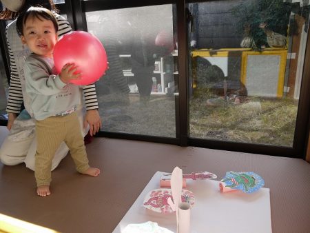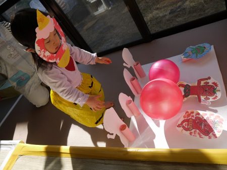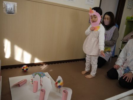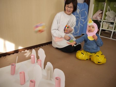 豆入れゲームも、ちょっぴりおにの顔が怖かったけど、新聞紙の豆を一生懸命投げ入れていました。