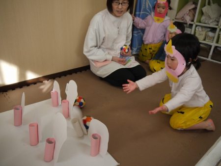 の歌を歌って、豆まきを練習していましたこどもたち。