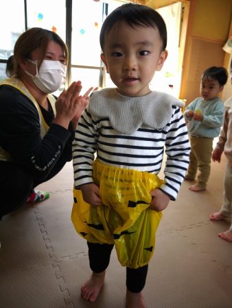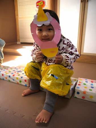 当日は、作ったお面と鬼のパンツをはいて、張り切っていましたよ。